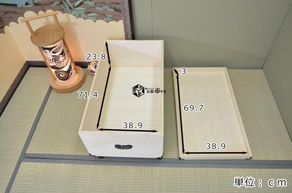 | 特徴 | 桐1段雛人形用収納ケースキャスター付きです。 桐は13MMの天然杢の桐を使用して総桐仕様に仕上げております。 蓋板底板には4MMの桐芯材に桐突き板で仕上げております。 左右に取っ手が付いておりますのでかかえる事も簡単で便利です 持ち上げても使えるように金具も強化しております。 高さも押入れに収まるように設計されております。 お買い上げ前にお手元の雛人形の大きさを確かめてからお買い上げ宜しくお願い致します。 桐の特性により大切な衣類を湿気や虫、カビから保護します。 より使いやすいサイズの押入れ収納ケースにもご利用可能です!! |