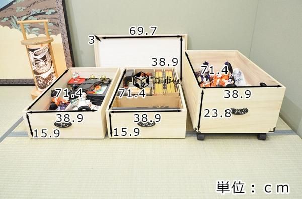 | 特徴 | 桐3段雛人形用収納ケースキャスター付きです。 2個セットで大変お得です!! 桐は13MMの天然杢の桐を使用して総桐仕様に仕上げております。 蓋板底板には4MMの桐芯材に桐突き板で仕上げております。 左右に取っ手が付いておりますのでかかえる事も簡単で便利です 持ち上げても使えるように金具も強化しております。 高さも押入れに収まるように設計されております。 7段15人飾りの人形が入ります。 お買い上げ前にお手元の雛人形の大きさを確かめてからお買い上げ宜しくお願い致します。 桐の特性により大切な衣類を湿気や虫、カビから保護します。 より使いやすいサイズの押入れ収納ケースにもご利用可能です!! |