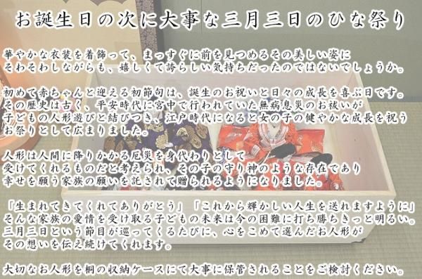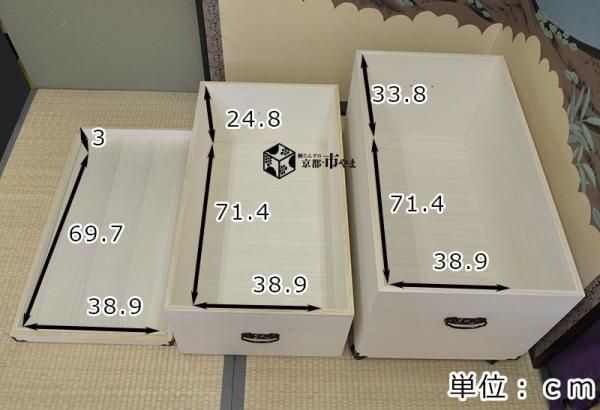 | 特徴 | 桐超深型2段雛人形用収納ケースキャスター付きです。 桐は13MMの天然杢の桐を使用して総桐仕様に仕上げております。 蓋板底板には4MMの桐芯材に桐突き板で仕上げております。 左右に取っ手が付いておりますのでかかえる事も簡単で便利です 持ち上げても使えるように金具も強化しております。 高さも押入れに収まるように設計されております。 7人揃いの人形が入ります。 お買い上げ前にお手元の雛人形の大きさを確かめてからお買い上げ宜しくお願い致します。 桐の特性により大切な衣類を湿気や虫、カビから保護します。 より使いやすいサイズの押入れ収納ケースにもご利用可能です!! |