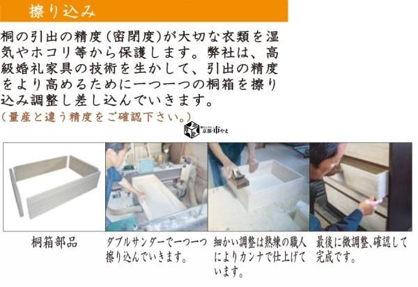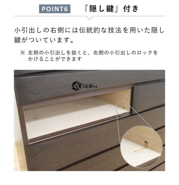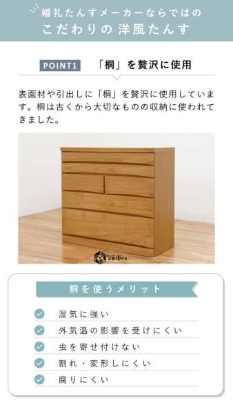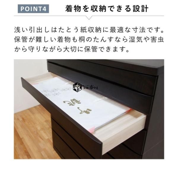 | 特徴 | 家具産地福岡県大川で作られた桐たんす 118cm幅8段 桐無垢 ナチュラル ダーク の 2色対応 着物収納に最適 桐箪笥 桐タンス ローチェスト 垣板に16mm桐無垢板を使用し 強度が違います!! 7段引出し・タトウ紙を折らずに浅引き約1-2枚、中段約4-5枚下段5-6収納できます。 (生地の厚みにより違いがあります。) たとう紙も折らずに収納できるワイドサイズで、 クローゼット収納としても利用できます。 |