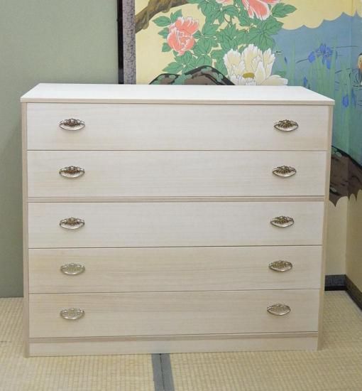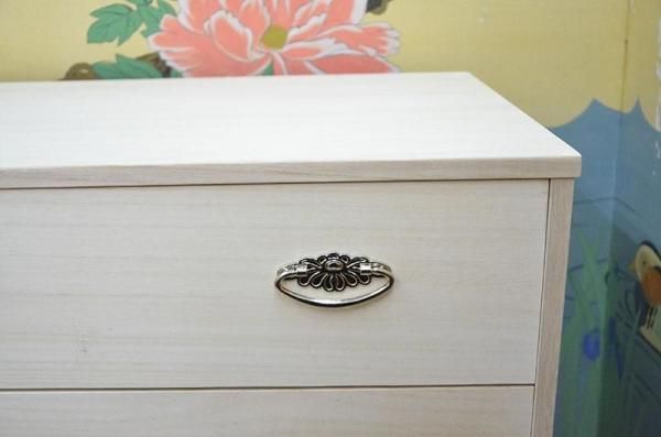 | 特徴 | 初めての桐タンスにはもってこいの大容量5段シルバー取っ手桐タンスです。 桐職人が一生懸命作った国産品で完成品になります。 天板・側板の厚みも15mmを使用しておりますので強度が違います たとう紙を折らずに収納できる幅広サイズです。 最上段に取り外し可能の中仕切りも入っておりますので、 小物などの仕分けにも大変便利です。 5段引出し・各1段ごとにタトウ紙を折らずに約4〜5枚収納できます。 (生地の厚みにより違いがあります。) クローゼット収納としても利用できます。 |