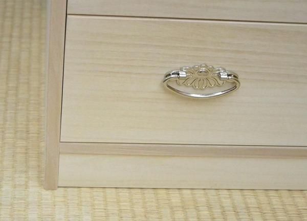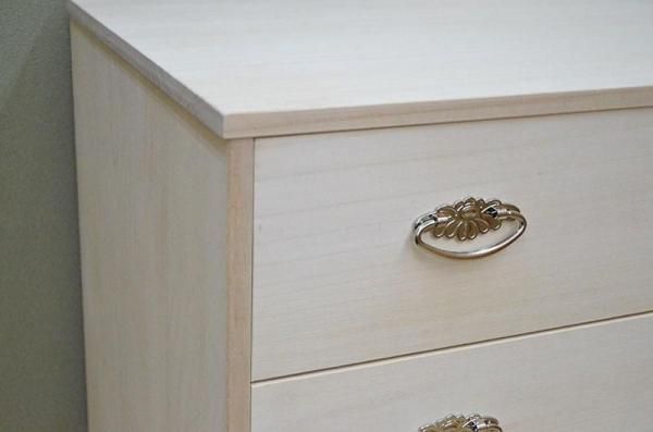 | 材質 | 本体・・・・・ 桐天然木無垢板15mm 引出し・・・ 桐天然木無垢板13mm 背板底板・・・4mm桐合板 |