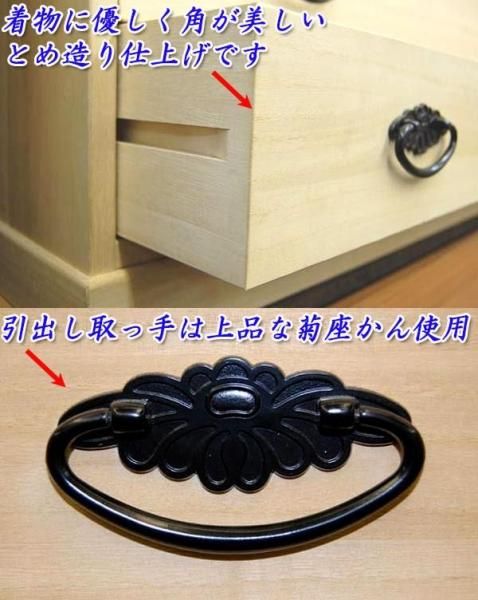 | 特徴 | 桐システムタンスロウ引き仕上げsk3タイプ3段 金具に菊座カンを使用しております なおかつ、天板・側板の厚みも15mmを使用しておりますので、強度が違います!! 桐材に厳しい社内基準を満たした良質で本物の桐を使用しておりますので、 きれいな節のない木目と色も安定しております。 接着剤にもこだわりをもっており、フォースター(四つ星)の安全基準を 誇っている接着剤を使用しております! 引き出しの中にもこだわりで面取りといって、木の表面や角を削ることによって 引き出しを開けた時の美しさが違います! 桐の特性により大切な衣類を湿気や虫、カビから保護します 1段引出しにたとう紙を折らずに着物が2-3枚程度入ります。(着物により違います) |